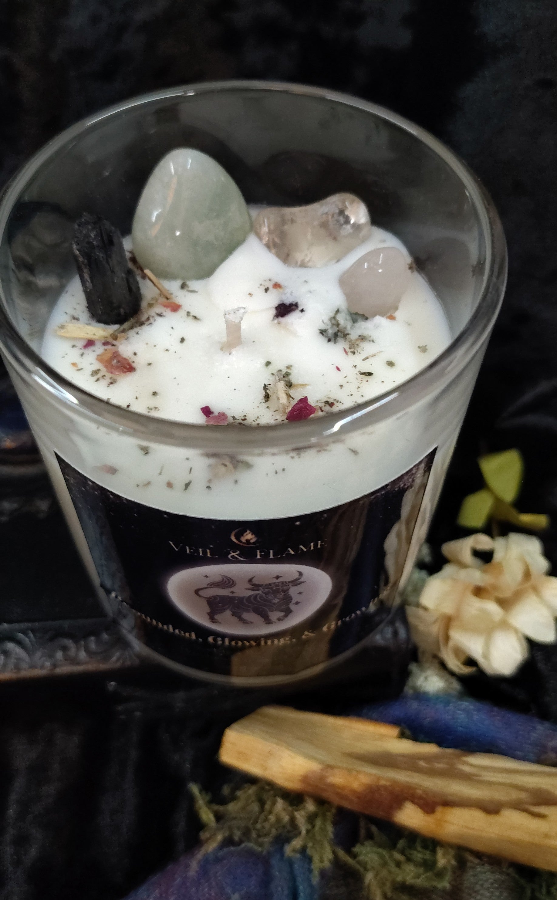 Scented with birch, black pepper, vetiver and patchouli. Earthy, grounded, protective. Each finished with a handmade herbal blend and chosen stones from local shops. Charged with the Taurus supermoon to amplify the energy. Green adventurine, Smoky Quartz, Black Tourmaline and Rose Quartz.
